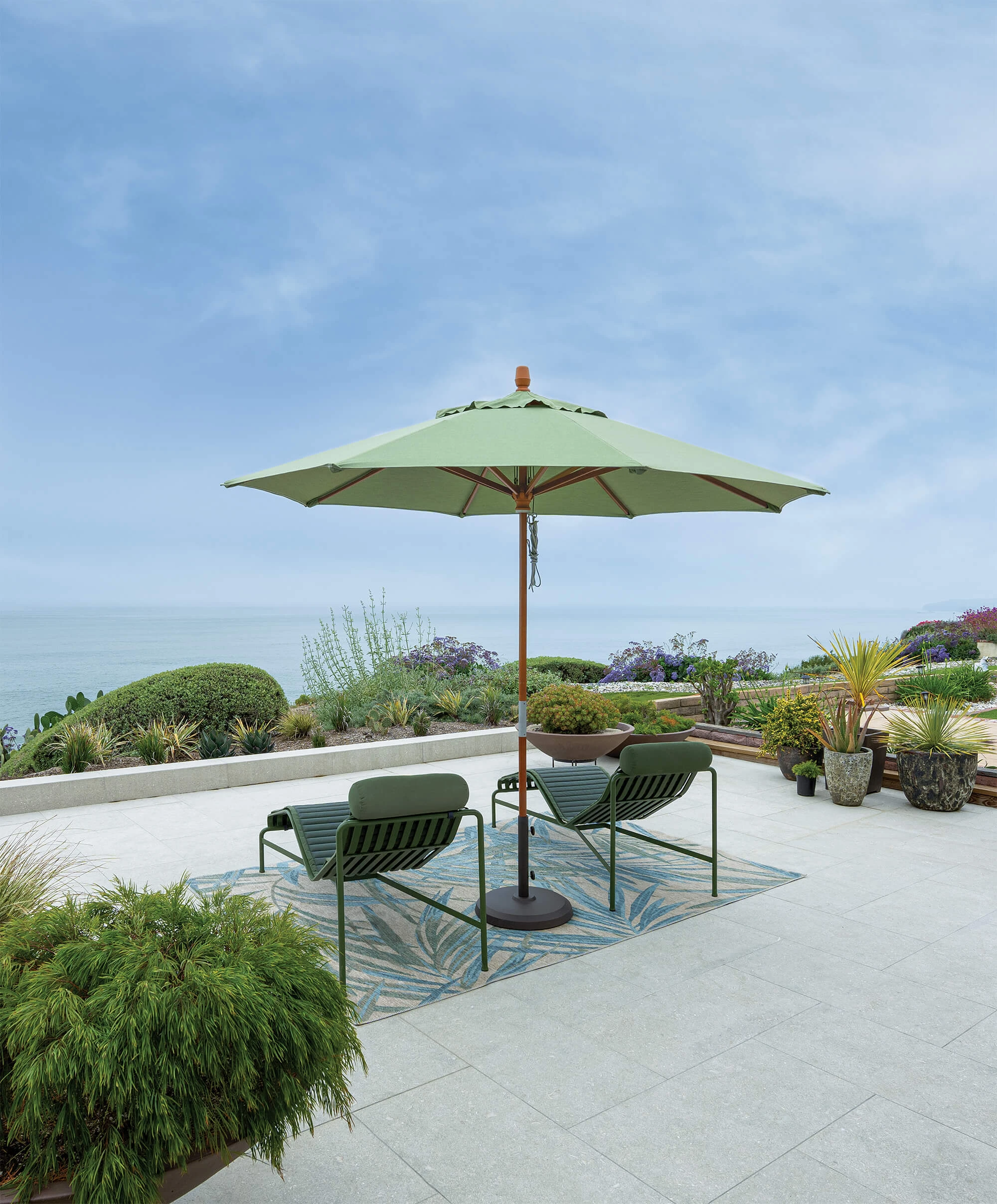 This is a 9′ Quad Pulley Lift Market style umbrella from Treasure Garden and comes with either a double or single wind vent. Treasure Garden’s hardwood unit that utilizes a rope and pulley system to raise and lower the umbrella. It has a standard 36″ bottom pole. Please scroll down to see fabric options, delivery times and more information about these umbrellas